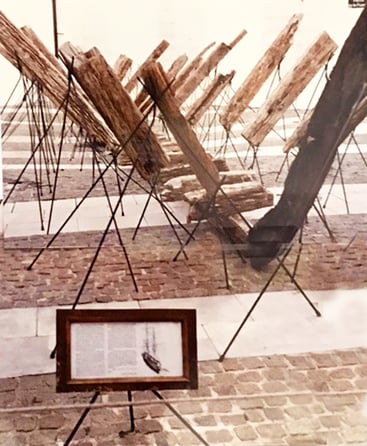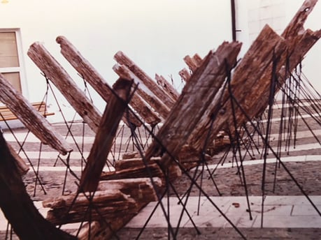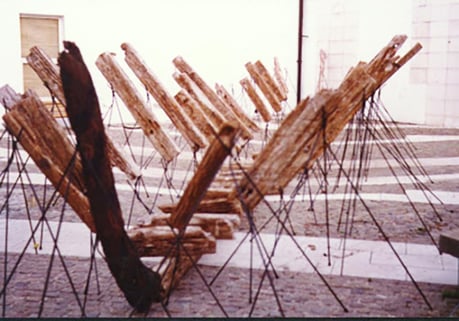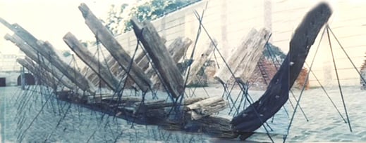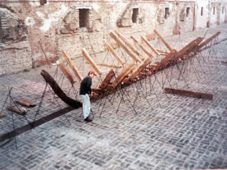 But the reconstruction immediately appears unfinished and seems aborted: the keel and frames of the alleged ship are barely outlined and the logs, surprisingly, don’t conceal their origin. Every figure is scarcely a transient sign, literally suspended, that subtracts itself from an idea of reconstruction sustained on the fidelity to the original model. These are only artificial ruins, simulated remains of a ship accidentally stranded or sunk during some distant battle that the river might have brought through time. But these remains bring us neither arguments nor reasons that can explain the way to incorporate this event called “shipwreck” in a coherent narration. Nevertheless, despite being made-up remains, they go beyond their singularity and bring to us dramatic echoes of what is presumably the infinite misfortune of castaways. They remain as a silent testimony whose only historical marks are the space in which they are found and the alluded tragedy; they testify to the hypothetical shipwreck in the public space that serves as a setting: the most public of historical places.