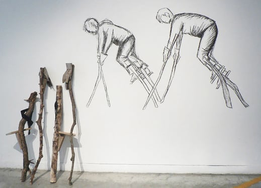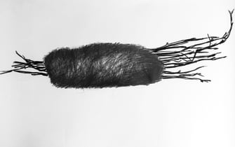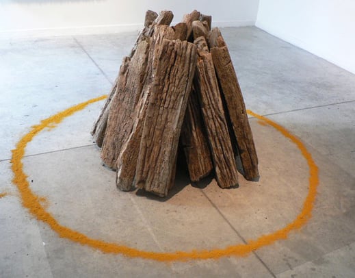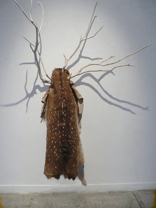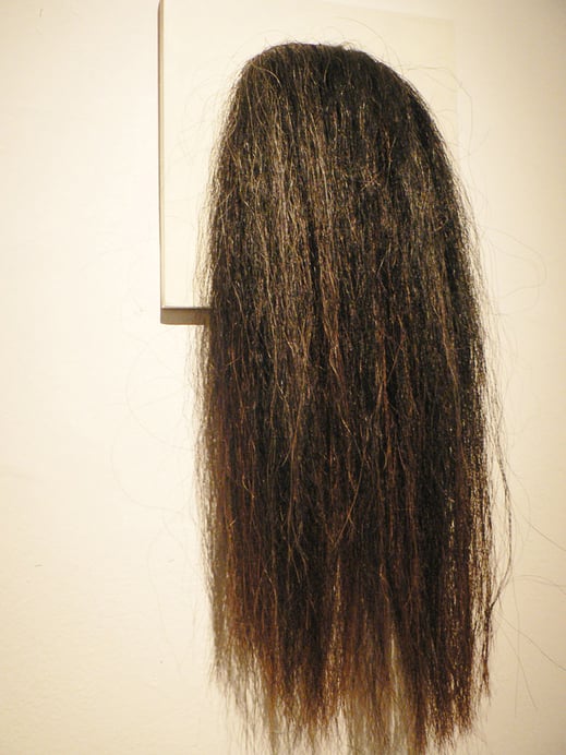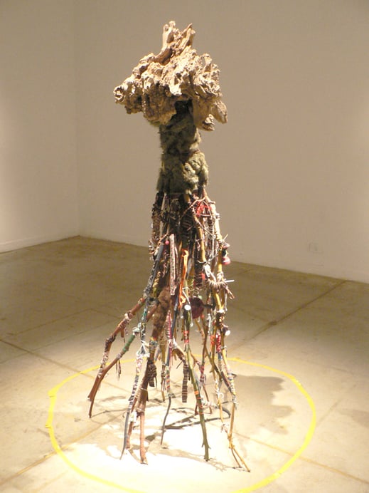 Madera, objetos varios, tinta, pigmento, cuero, lana y metal